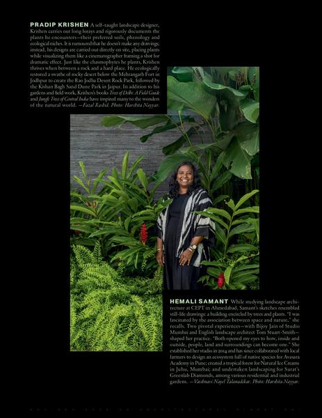 Architectural Digest India • 7th November 2024 [Print] The Plant Whisperers Varna Shashidhar was always passionate about the natural environment, but it took an internship with leading Sri Lankan architect Chelvadurai Anjalendran to help her appreciate the richness of the built form in symbiosis with the landscape. Her experience led her to pursue a master’s degree in landscape architecture at Harvard University, with a resolve to set up her own practice, focusing on creating contextual environments that celebrate the natural beauty and nuances of India and South Asia. “Cultural landscapes in India have the power to touch the chitta [human consciousness], which transcends the sensorial. That is a quality I aspire to bring into my work,” says Shashidhar. Since founding VSLA in 2013, she hasn’t been afraid to get her hands dirty—literally. Among her notable achievements are a didactic ecosystem for Neev Academy in 2015, a garden sanctuary with native edibles and medicinals for Byg Brewski, then India’s largest microbrewery, in 2018, and a one-acre urban remediation landscape with over 75 species of local and adapted vegetation for Bangalore International Centre in 2019. She is currently working on creating a healing landscape at Kathiwada, Madhya Pradesh. And yet, she’s nowhere near done.